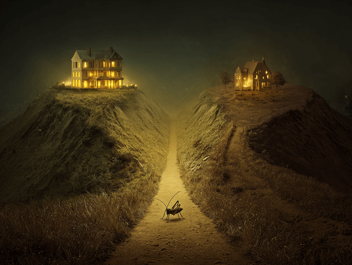 Impactado el grillo por tan gran contraste, pretende seguir de largo; no sabe quién es la falsa. Cuando se aproxima al valle entre las dos colinas, antes de saltar al otro lado, de cada casa sale alguien a su encuentro. Se detiene y escucha; tal vez digan algo al oído, ya que el ojo no queda convencido.